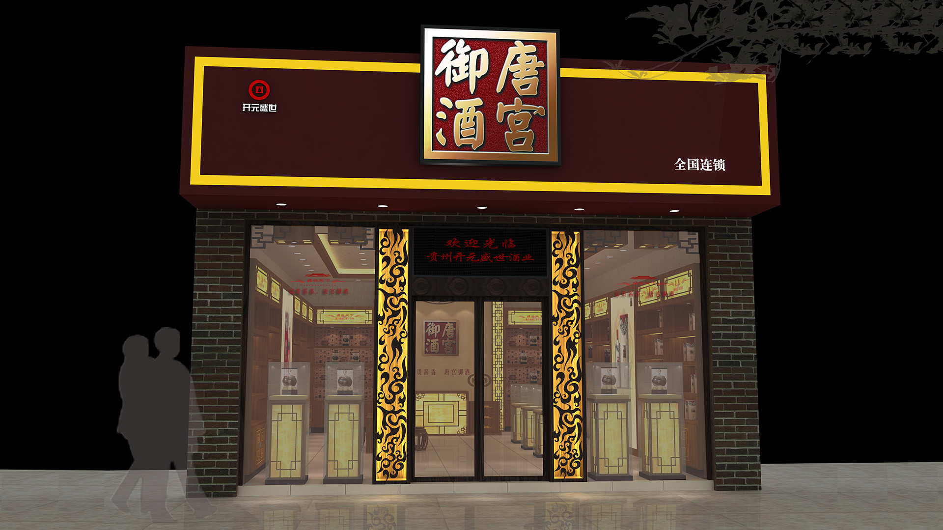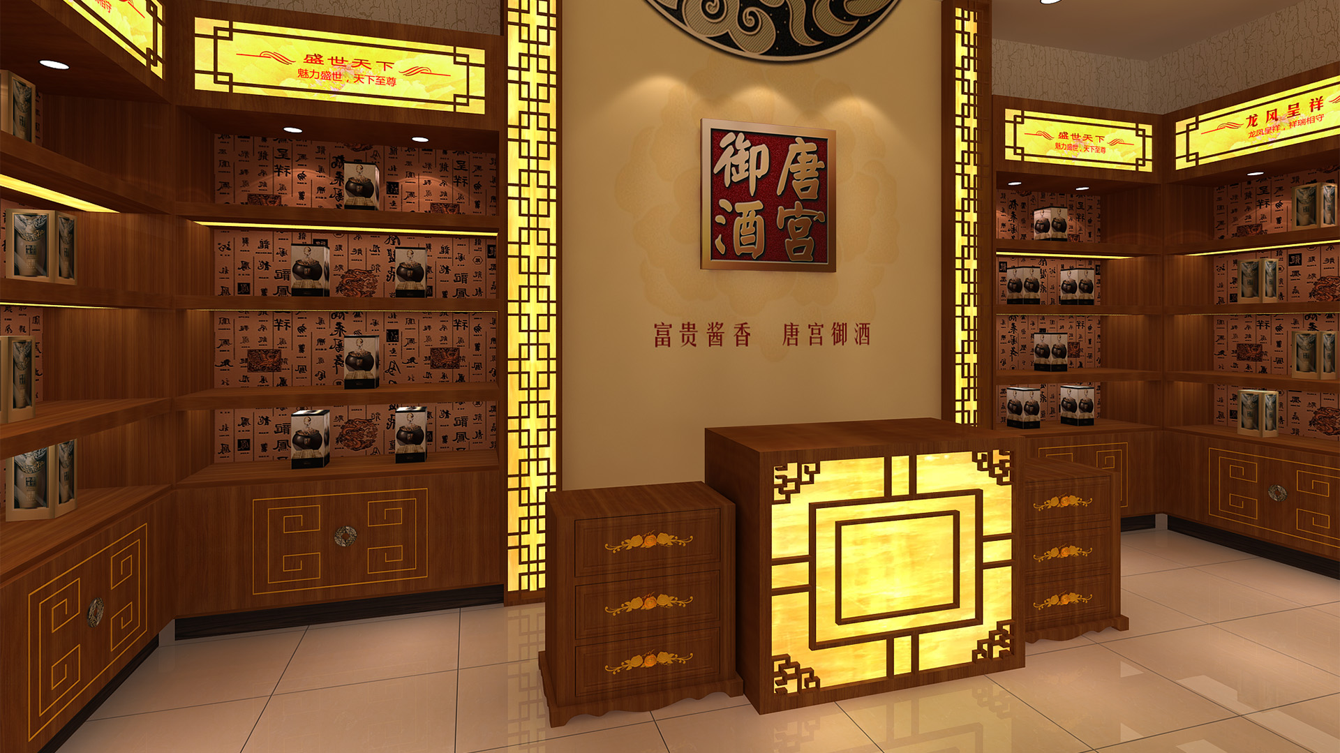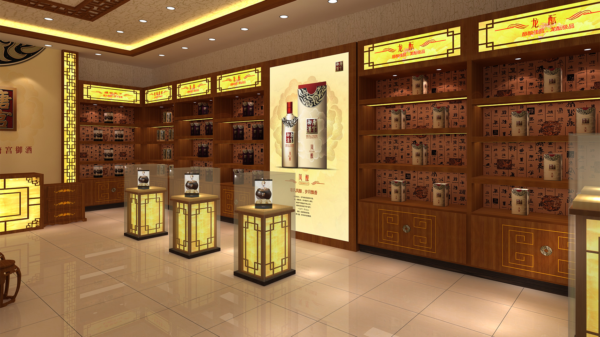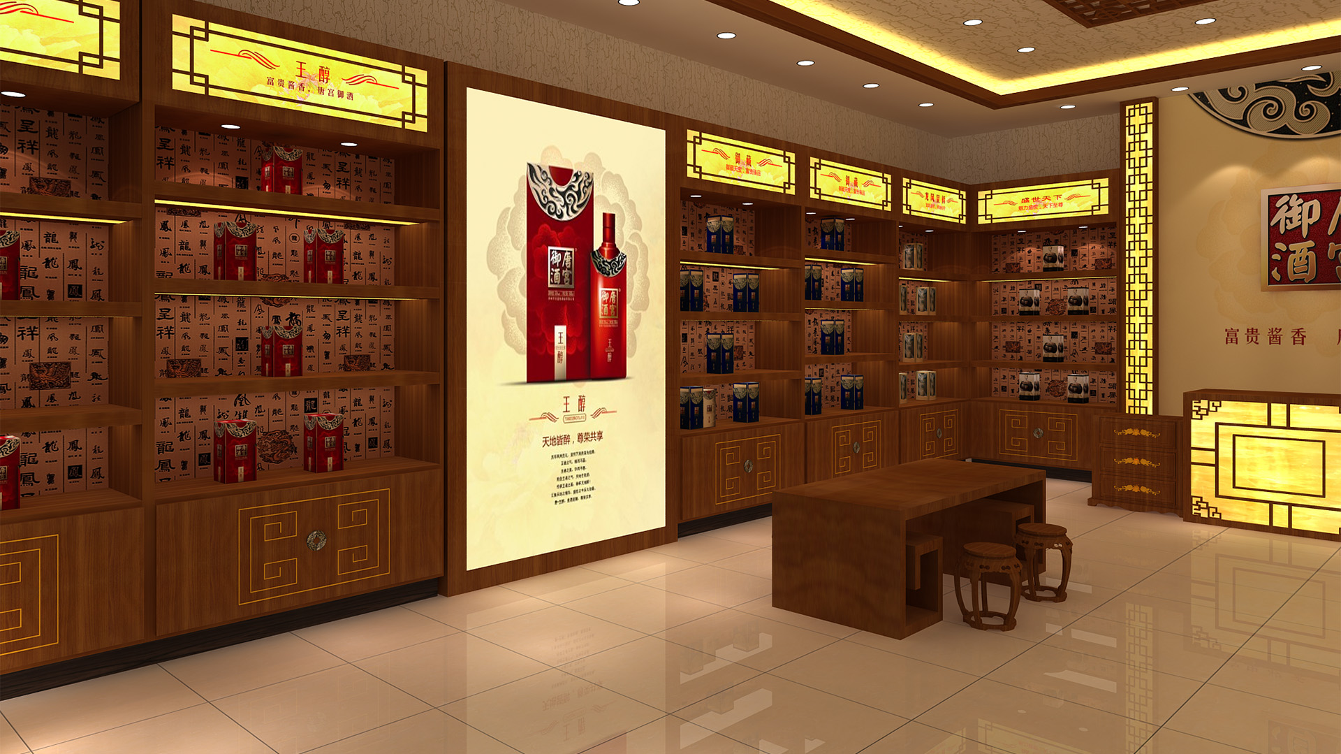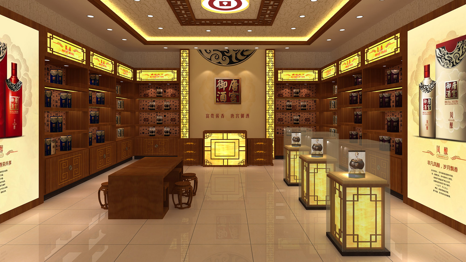 贵州唐宫御酒酒业有限公司是一家集白酒生产、白酒研发,包装销售为一体的综合性酒类销售企业。公司在贵州省茅台镇拥有生产基地,形象专卖店设计从酒文化产品形象店定位出发,突出“酒文化”的概念,采用了红色、白色、黄色、作为主色调,运用了大量现代简约的直线中式造型,营造出一个具有文化感的展厅环境。